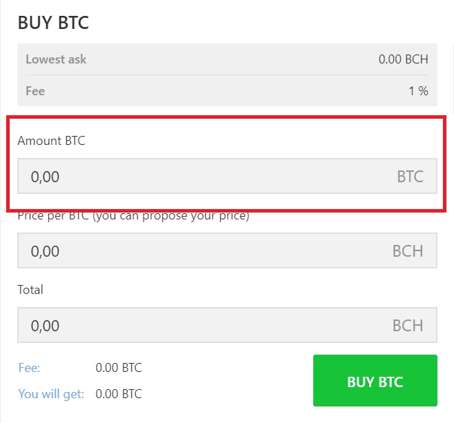2. Scroll down to find the order form. On the left side you can see buy, on the right the sell order form. In the "Amount" box, enter the amount you want to buy.